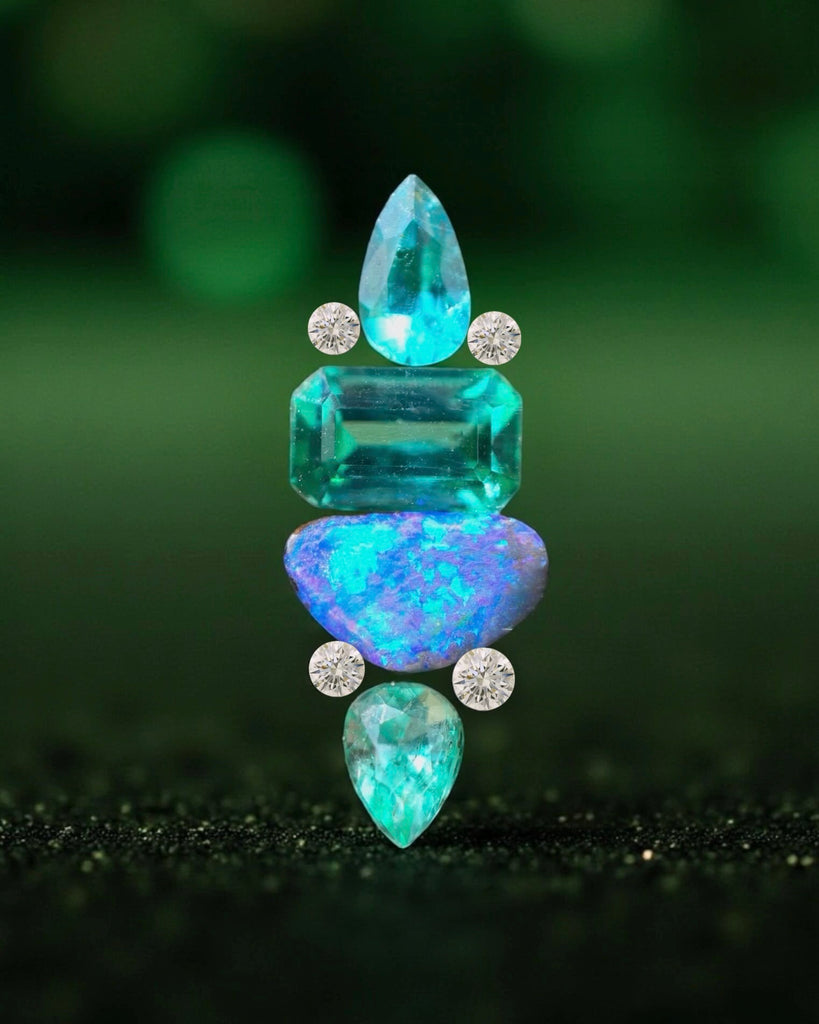 (Made to Order) Black Boulder Opal Totem Ring or Pendant With Blue and Green Tourmaline, Emerald and Diamond Accents in 14k Yellow White or Rose Gold