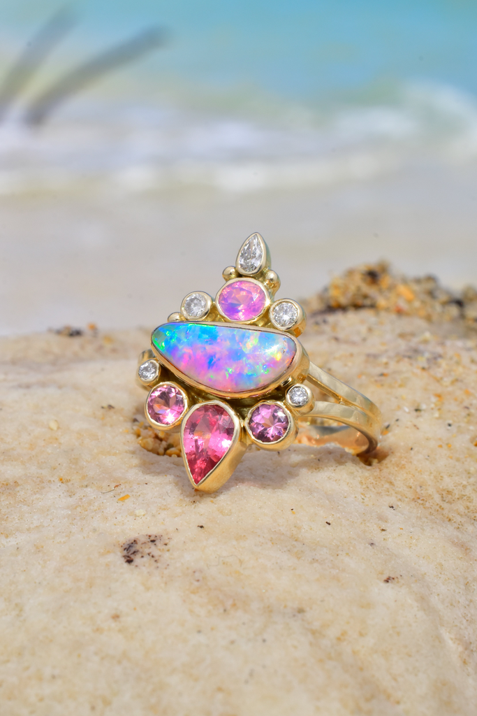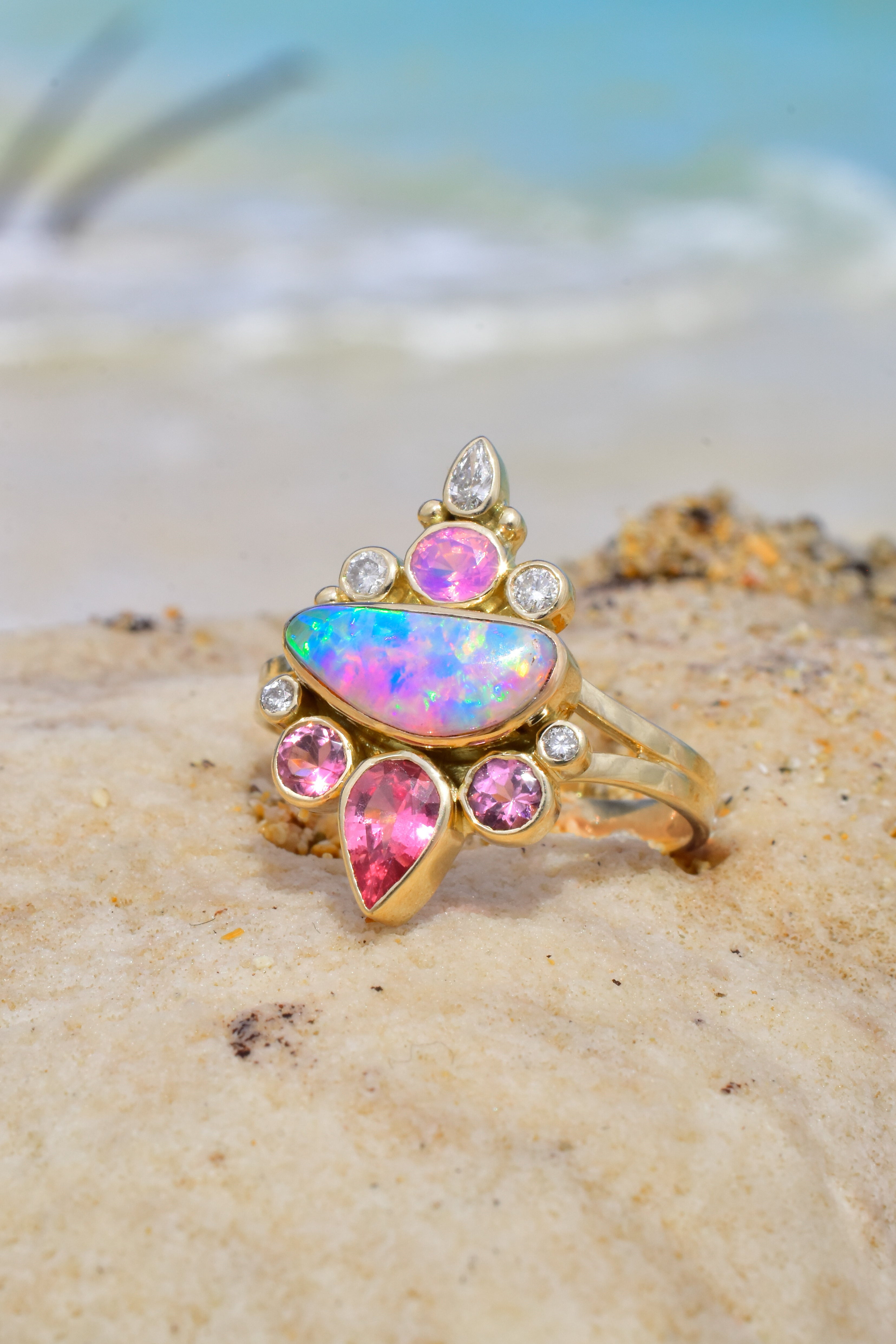 This Stunning Layout features the most beautiful Opal, accented with an equally amazing layout of opalescent  sapphires, emeralds, and diamond accents! An elegant organic statement piece that will sweep you away every time gaze look at it!