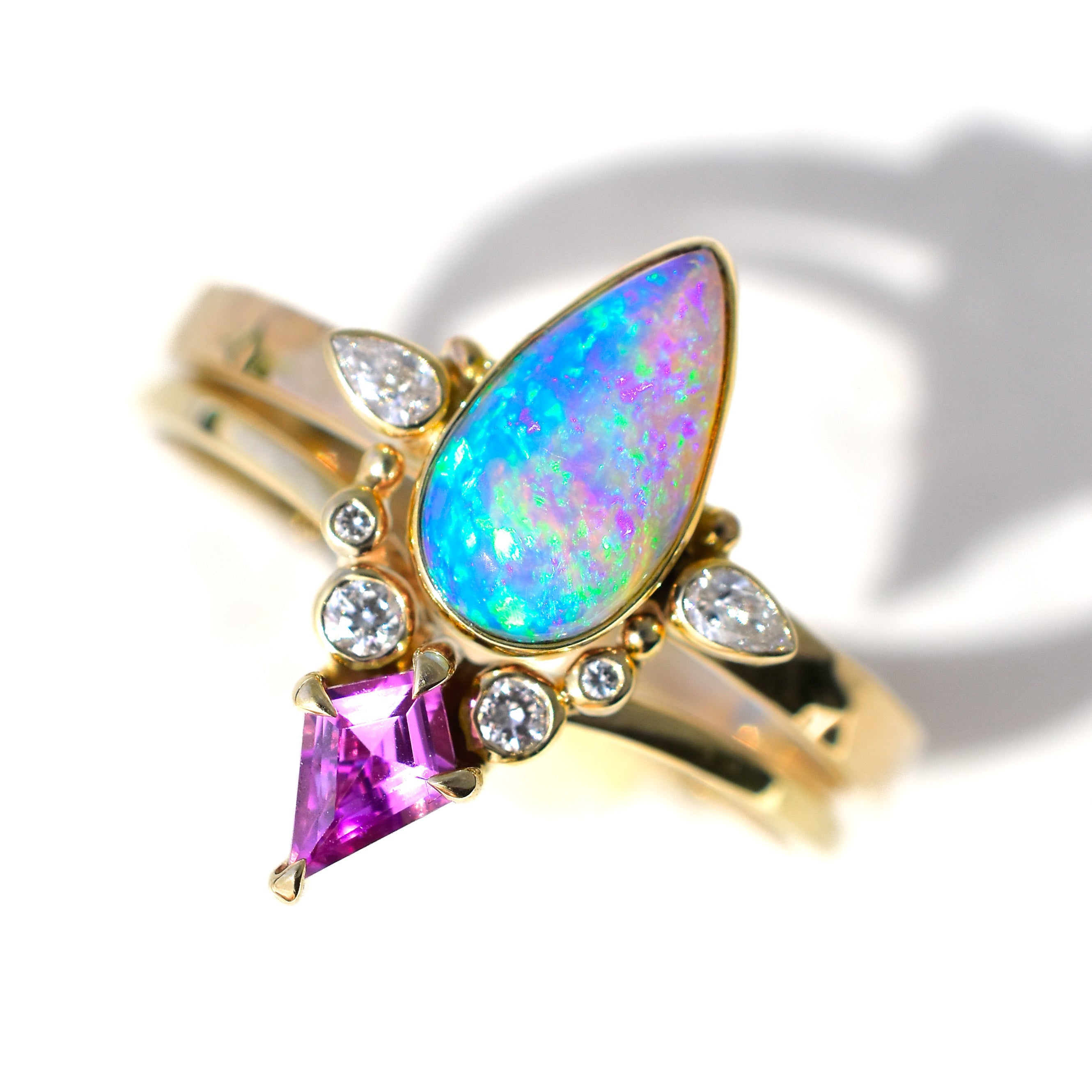 The pink and lilac Saphire Chevron Lotus Bud ring has masterfully elevated my wedding band, adding a unique pop of colour and elegance. It is glorious on it’s own making a statement that gets so many compliments or can be combined with others, to really shine.
