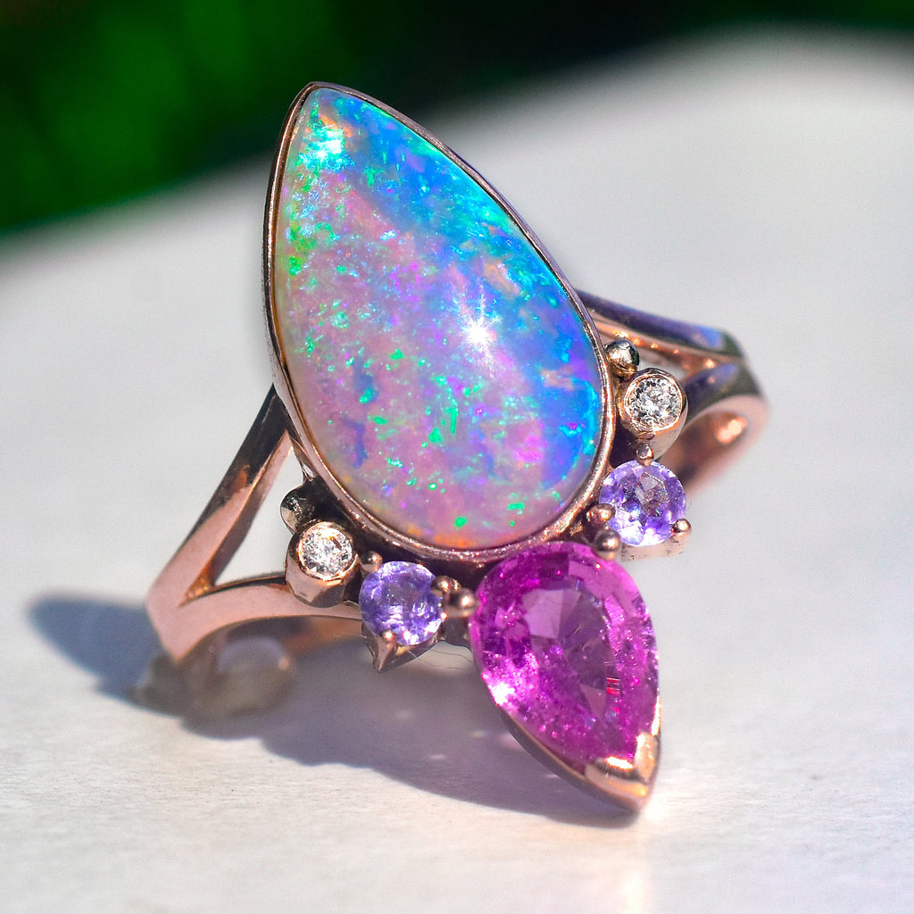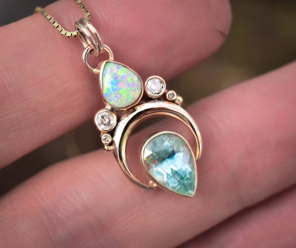 My handmade Angel Alchemy pieces are made for long-term wear, using solid Australian Opals which I custom cut for my one-of-a-kind designs as well as solid 14k gold and natural fine gemstones. Unlike many other opals, Australian Opals are non-porous, so they remain undamaged in wet conditions and maintain their hue and luster over time, making them an ideal choice for heirloom jewelry.