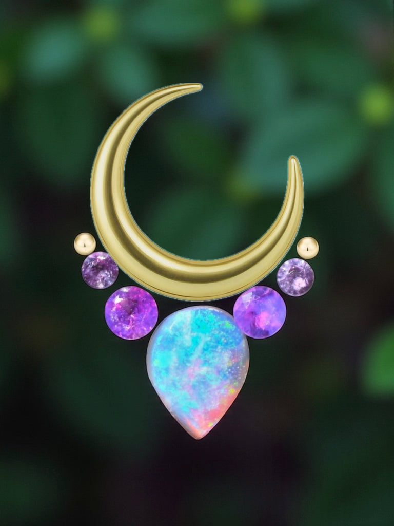 Celestial Mirrored Moon Pendant with Statement Sized Fiery Rainbow Color Shifting Australian Opal with a Diamond in 14k yellow gold