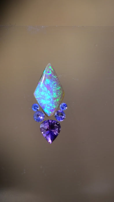 A beautiful bluish, purple lightning ridge Opal that I carved into a kite shaped stone that can be set into a variety choices of designs, either with colored gemstones or diamond, She has a beautiful glow about her and a gorgeous sparkle of fairy dust like green fire!