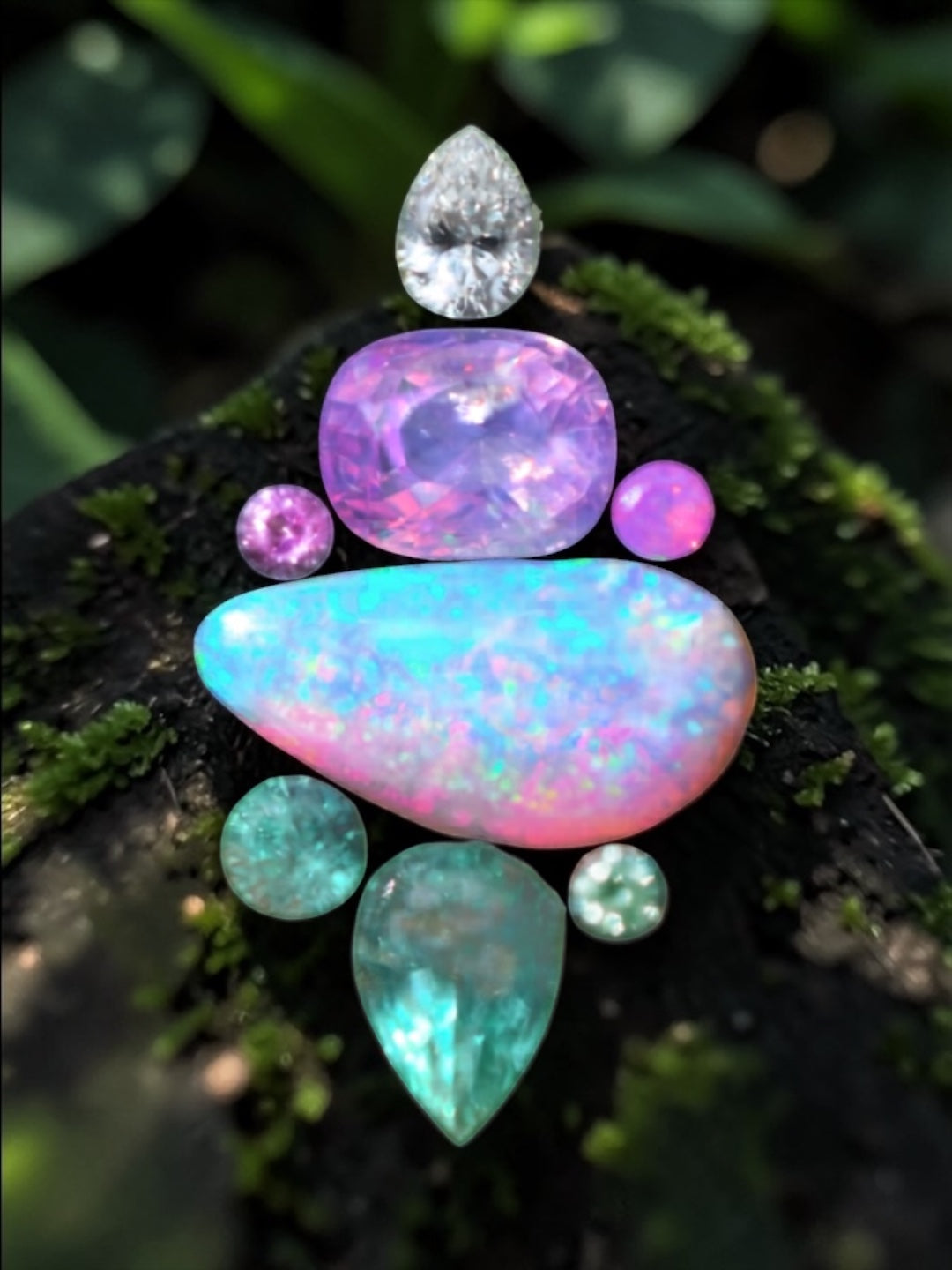 This Stunning Layout features the most beautiful Opal, accented with an equally amazing layout of opalescent  sapphires, emeralds, and diamond accents! An elegant organic statement piece that will sweep you away every time gaze look at it!