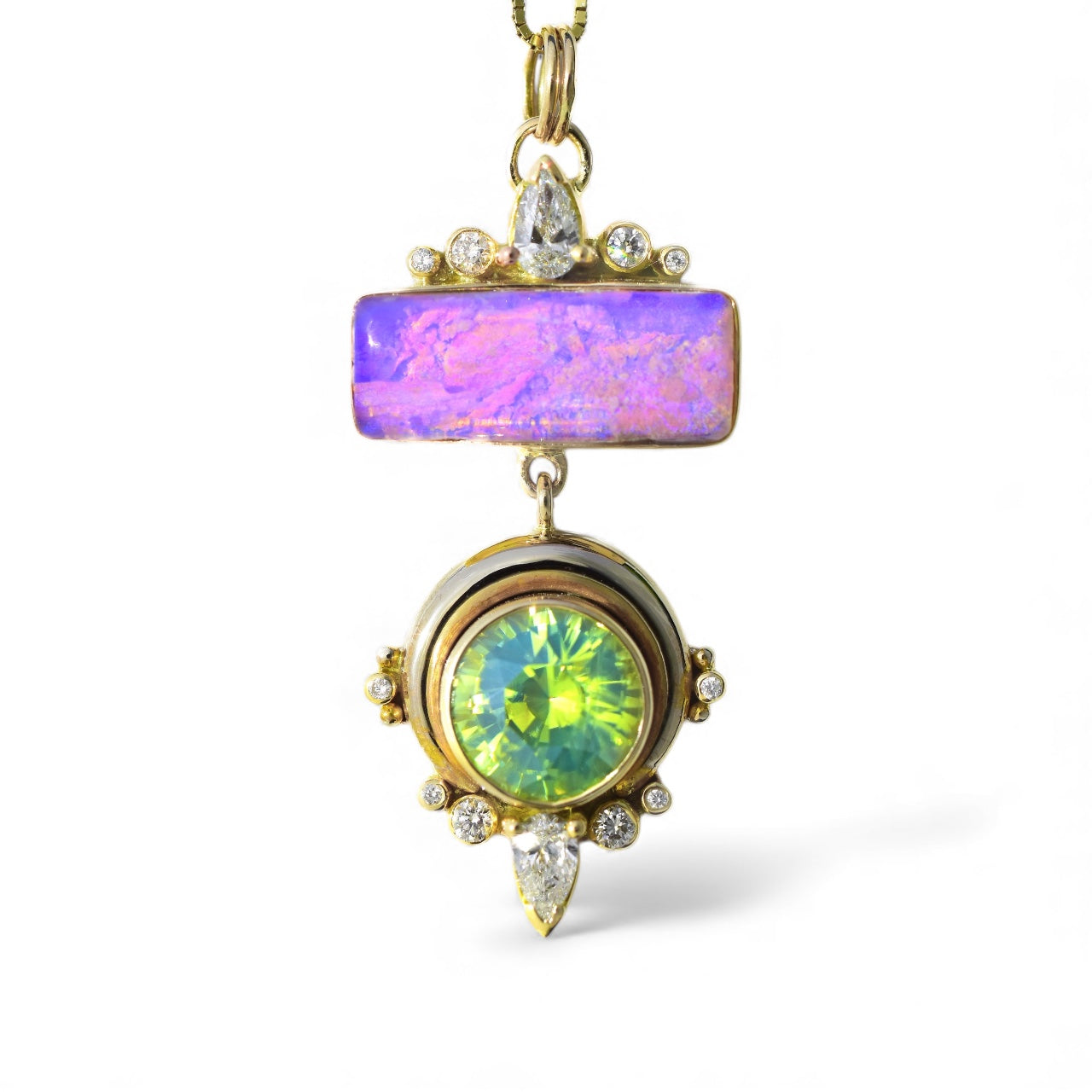 True North Pendant Featuring Australian Opal, Sri Lankan Opalescent Zircon, and Diamonds in solid 14k Yellow Gold