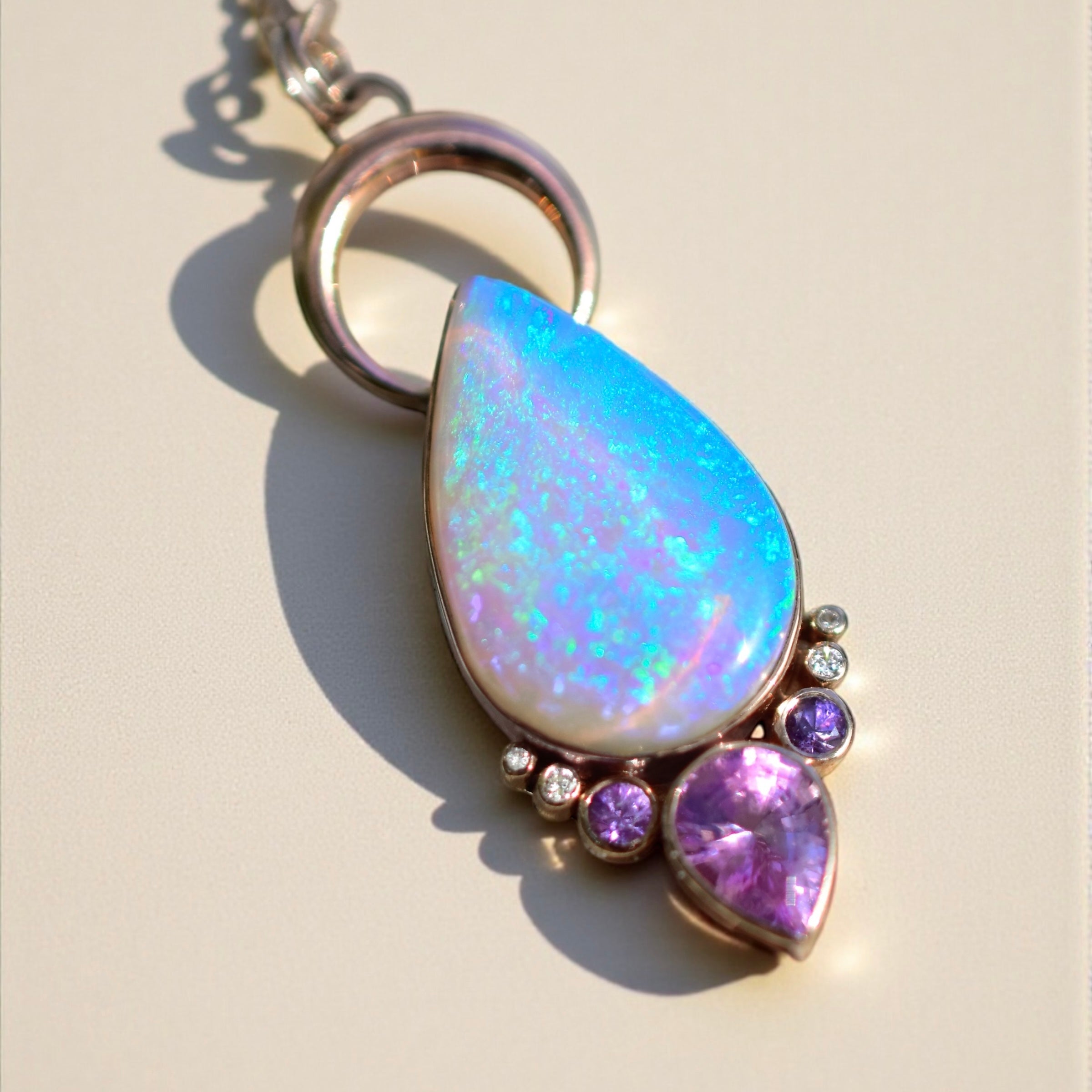 This pendant is so, so lovely! The Australian opal is crazy gorgeous!! The colors are amazing!! And the fuchsia sapphires are stunning! I love everything about this piece and I’m thrilled she’s a part of my collection! Thank you Mandi!