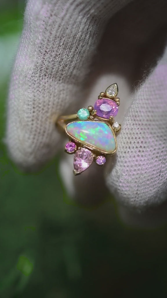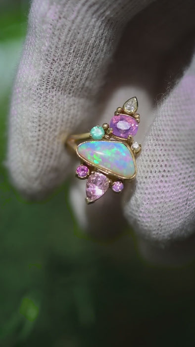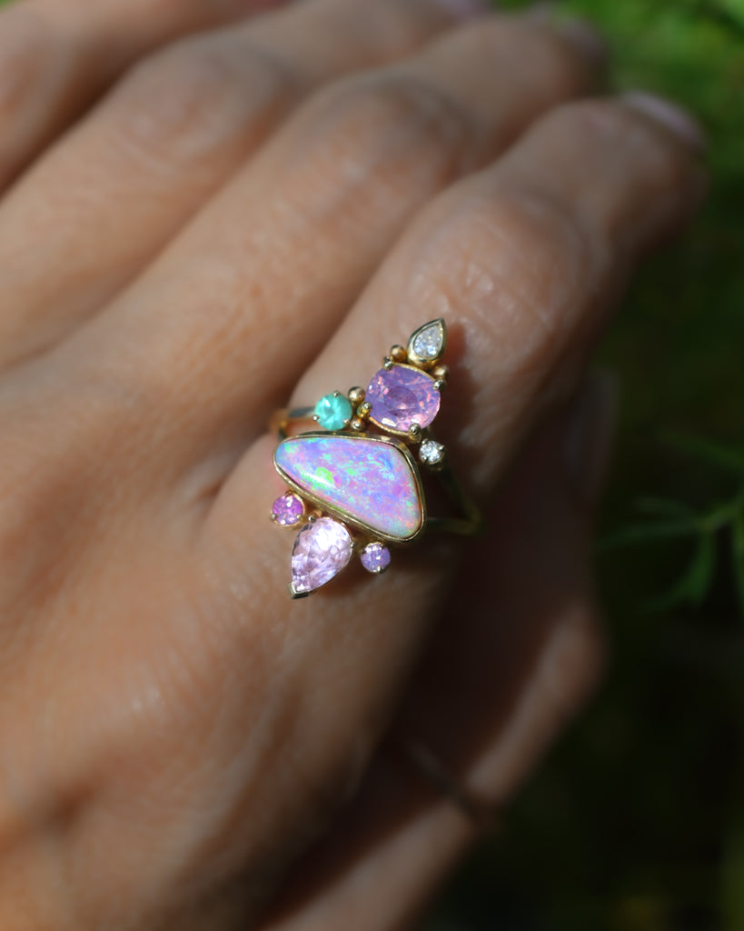 Mermaid hues  Pink Opal Pagoda Ring in 14k yellow gold with Opalescent Sapphires, Emerald, and diamond accents! A true wonder of Mother Nature. I haven’t been able to stop gazing at her! I love a magical ring I can get lost