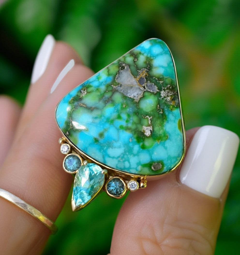High Grade Sonoran Gold High Grade Turquoise and Green Tourmaline Lotus Bud Statement Ring! I’ve had this piece of turquoise in my collection for many years. I absolutely love the colors and patterning of this stone, reminiscent of lush green spaces. It feels both watery and verdant like a bed of moss and ferns by a glistening stream at the golden hour. I’m really feeling the turquoise and gold alchemy right now it’s so nurturing, life giving and grounding