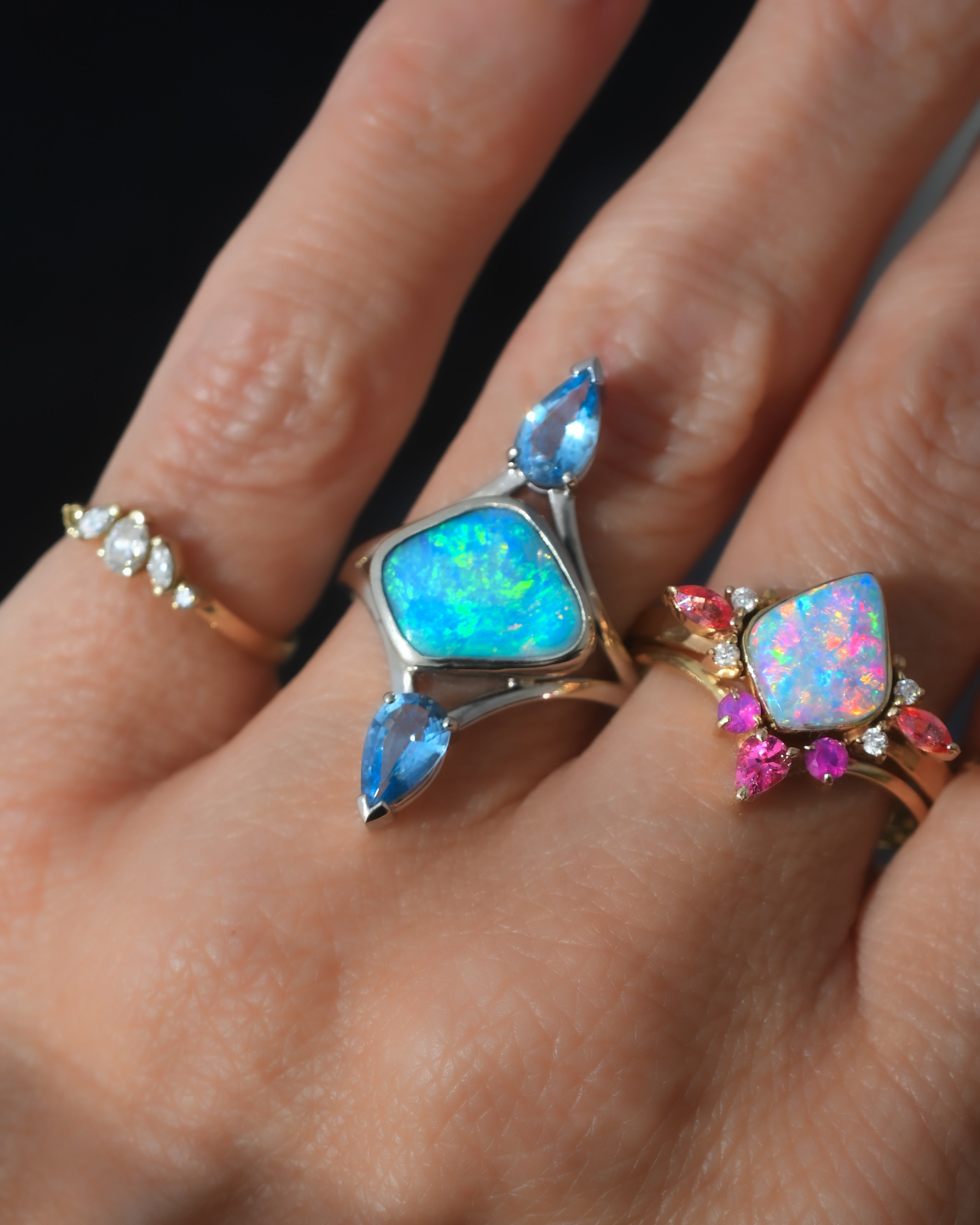 These colors!!!! The opal and aquamarines are each gorgeous and perfect together. I went with white gold and feel it sets off the blues really well. I’m thrilled with this ring.