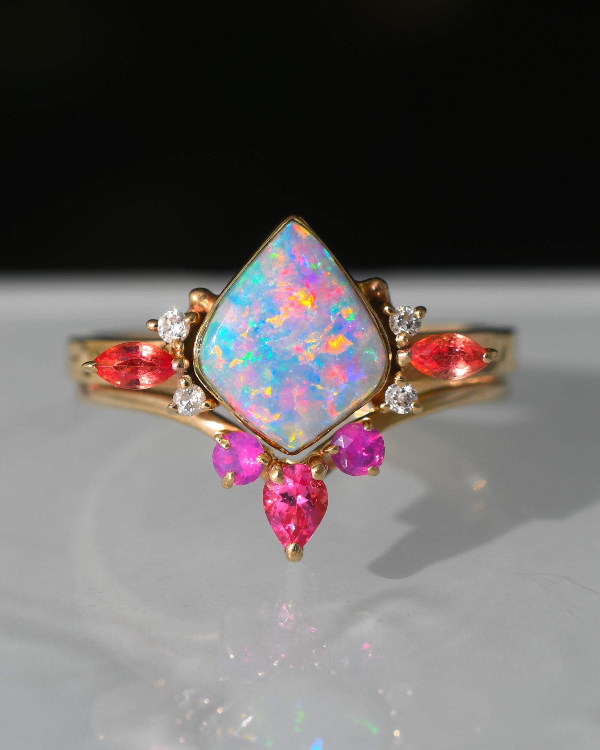 This incredibly special two piece Lotus Bud Opal Ring Set it’s made with a kite shaped fiery af Aussie opal displaying bright, reddish pink and all rainbow colors paired with the best quality and color of padparadscha sapphires, pink ruby,Opalescent Sapphires and diamonds in yellow gold! So many rare colors and qualities of magnificent gems coming together for the best sunset alchemy! It feels like a warm hug, a talisman for the heart and solar plexus! Something pretty different for me color scheme, wise! I’d love to know what vibes you’re getting from this radiant beauty!