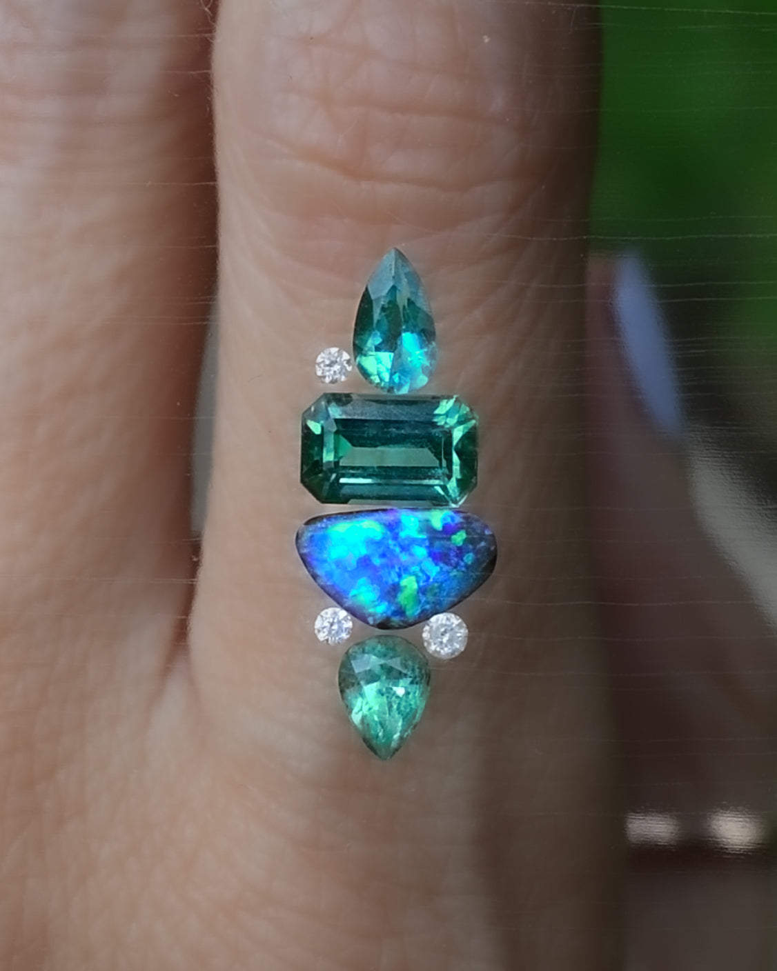 This Beautiful Totem Ring or Pendant features a stunning black Boulder Opal, perfectly paired with a cushion cut green Tourmaline, a beautiful teal tourmaline and emerald, accented with diamonds!